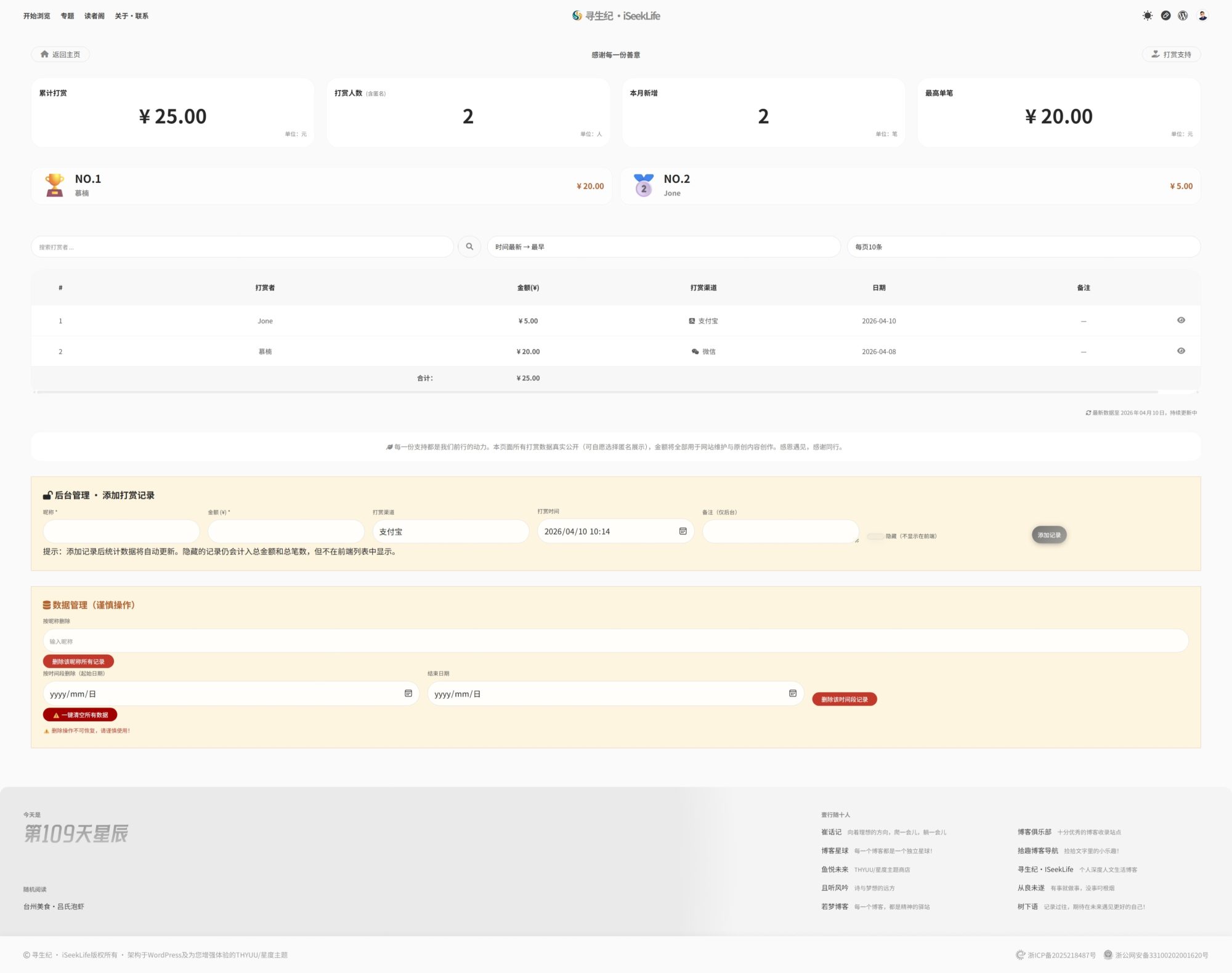 管理员不必到WP控制台插件设置选项卡增删打赏记录,而是直接在打赏者名单页面下方添加、删除或隐藏记录,同时还能编辑备注、按昵称或时间段批量删除。所有操作都会立即在前端页面实时更新,非常简便。