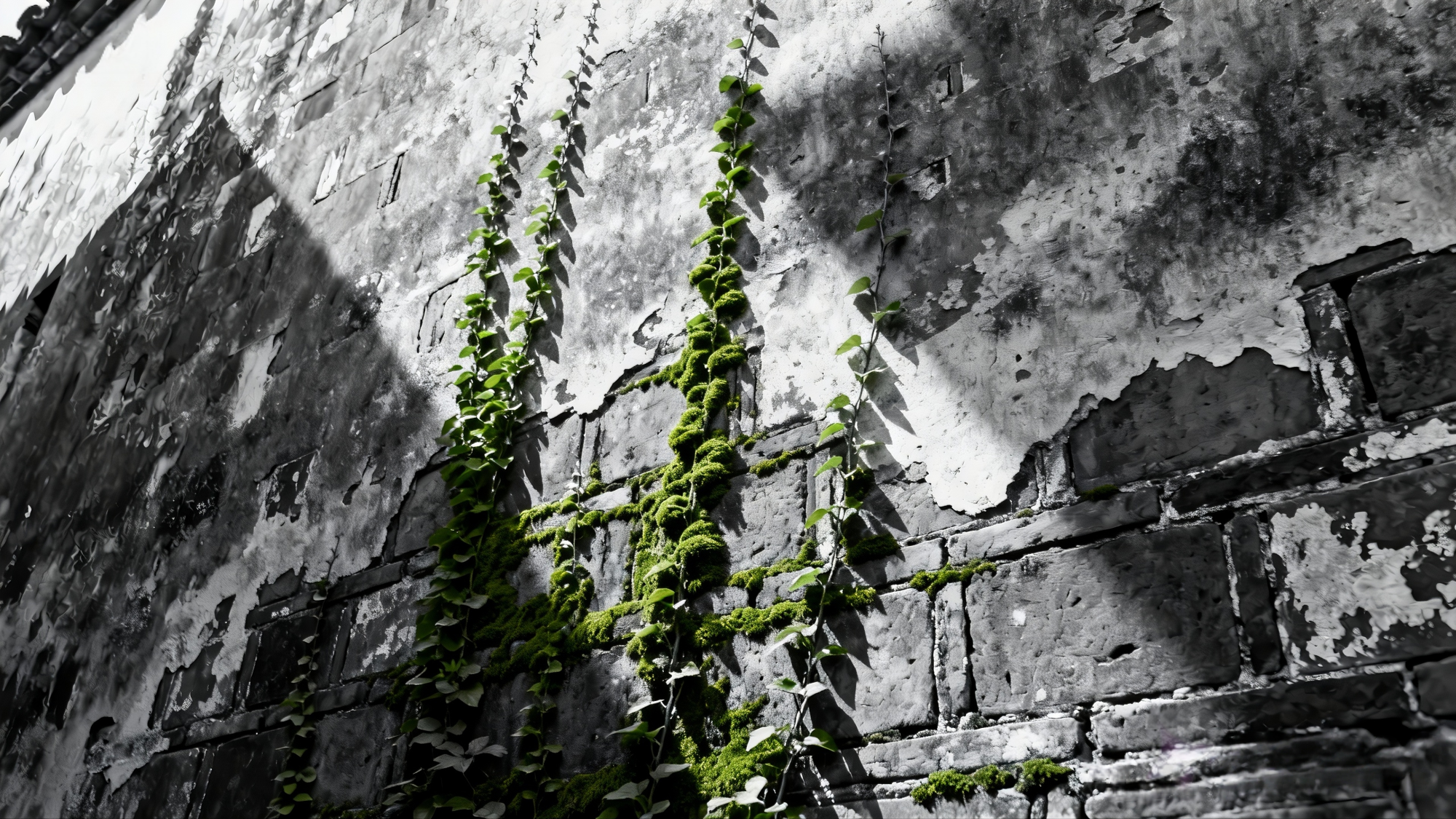 我俯下身,端起相机——青苔正沿着斑驳的墙面向天空生长,向左或向右,但总的方向是向上的。它们沉默而执着,像极了某些无法言说的渴望。我按下快门,把这些瞬间印成黑白相片。这或许是一种旁人无法理解的默契:我与这些青苔,都在等待同一片云经过。